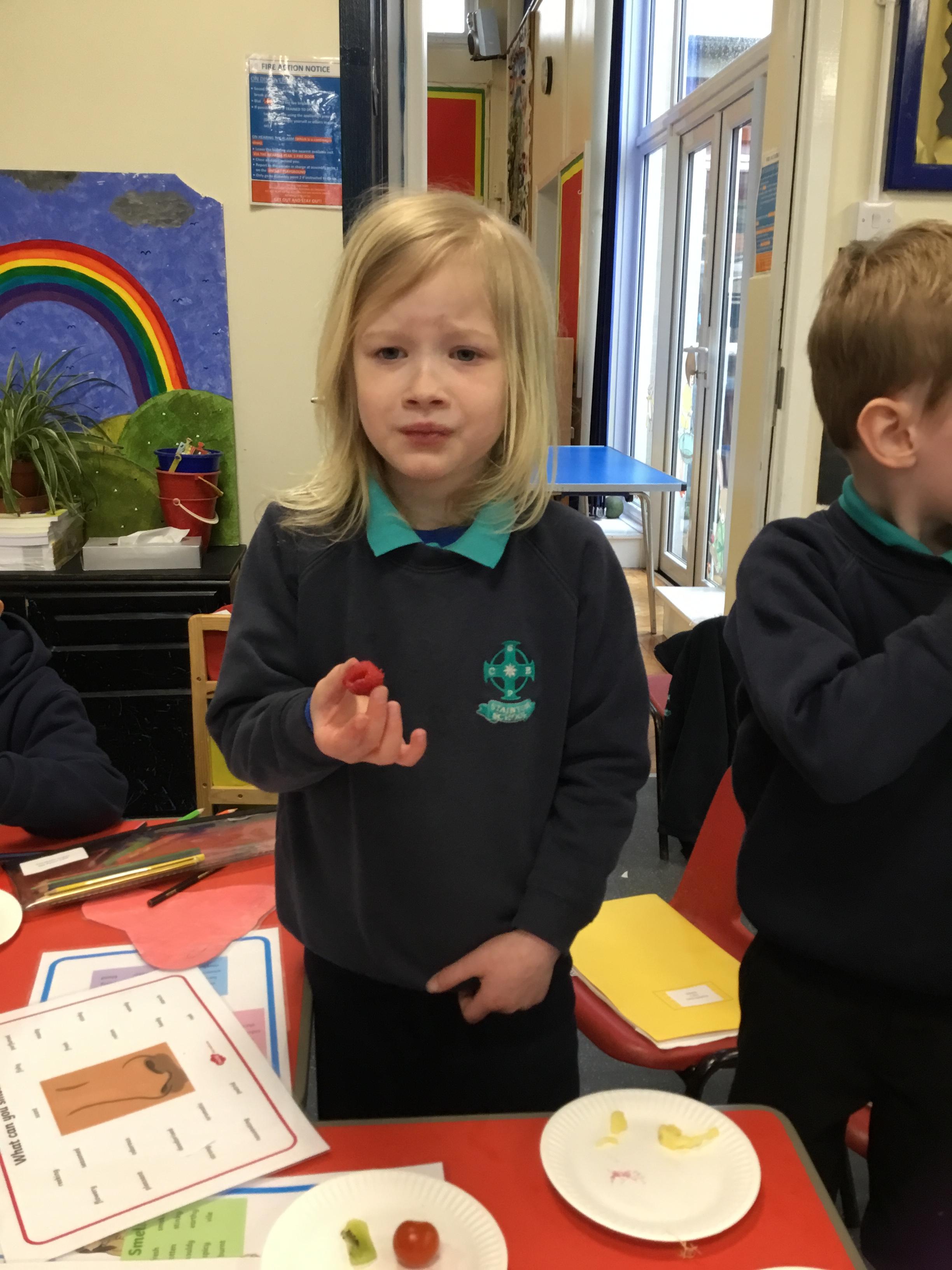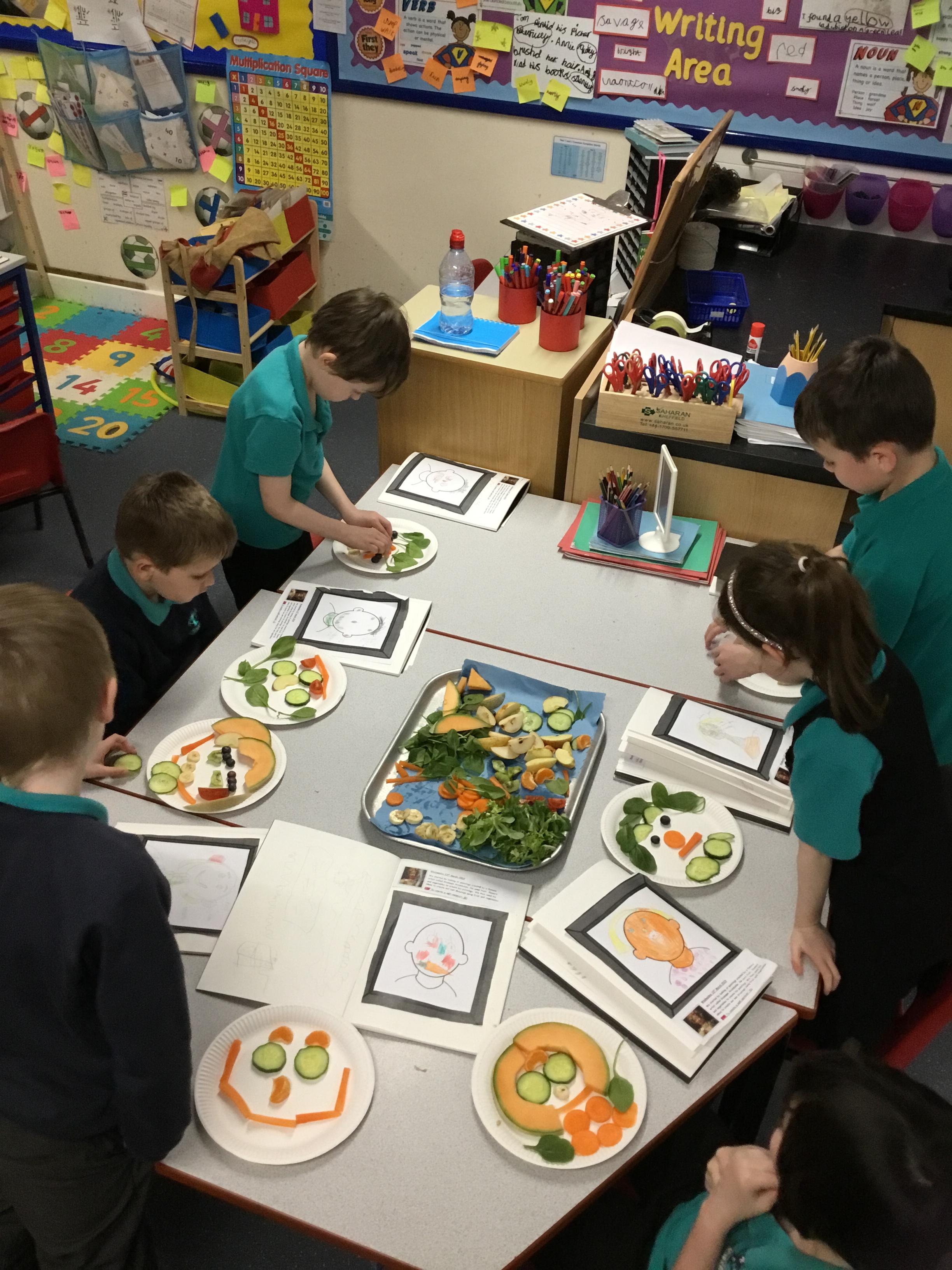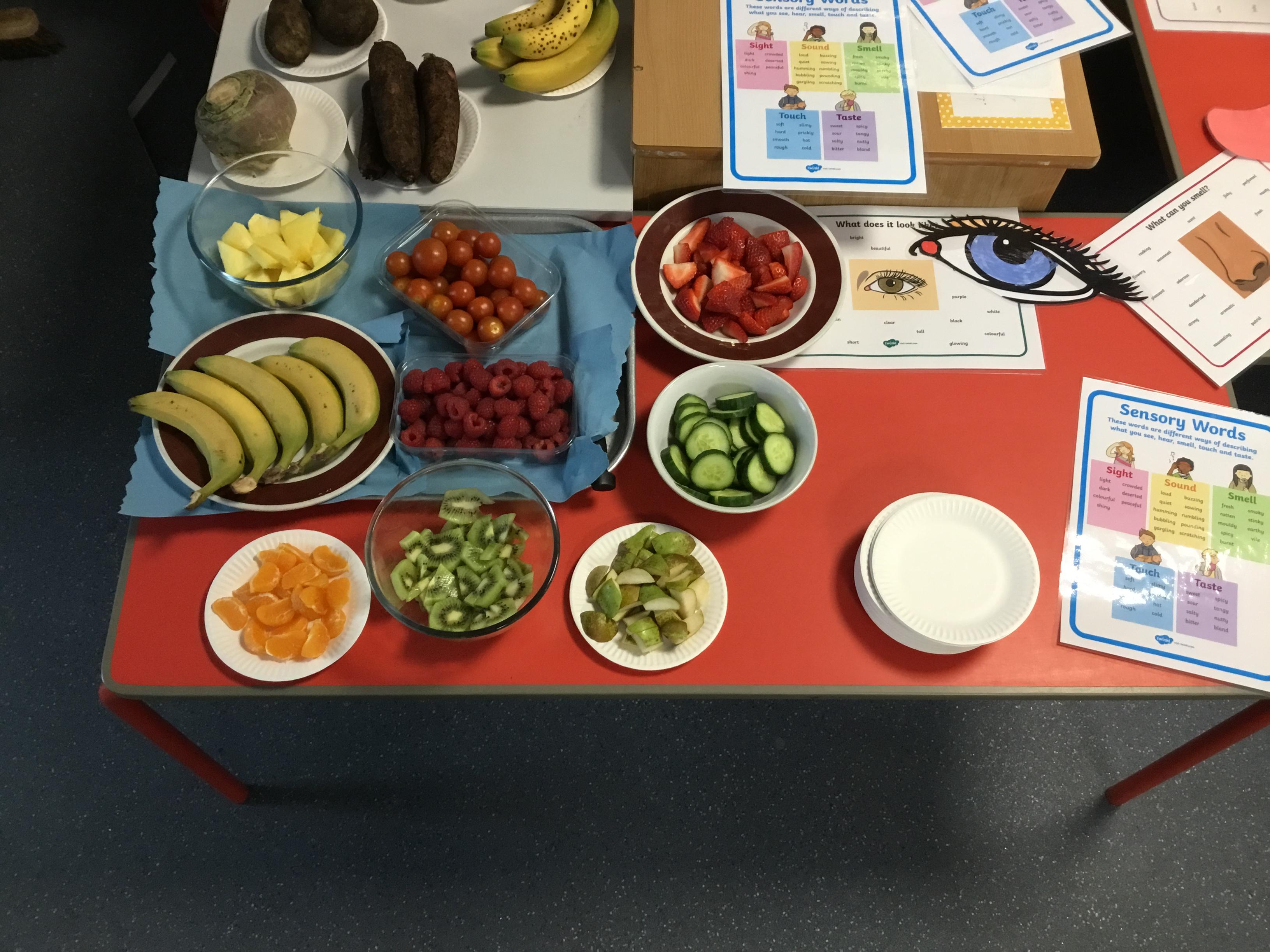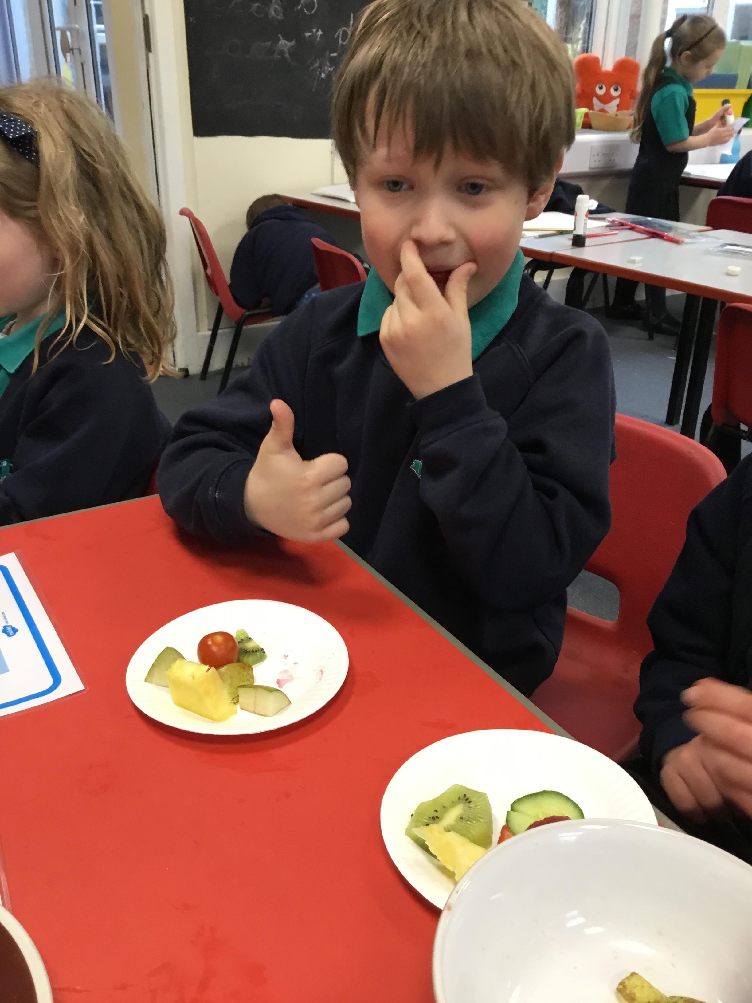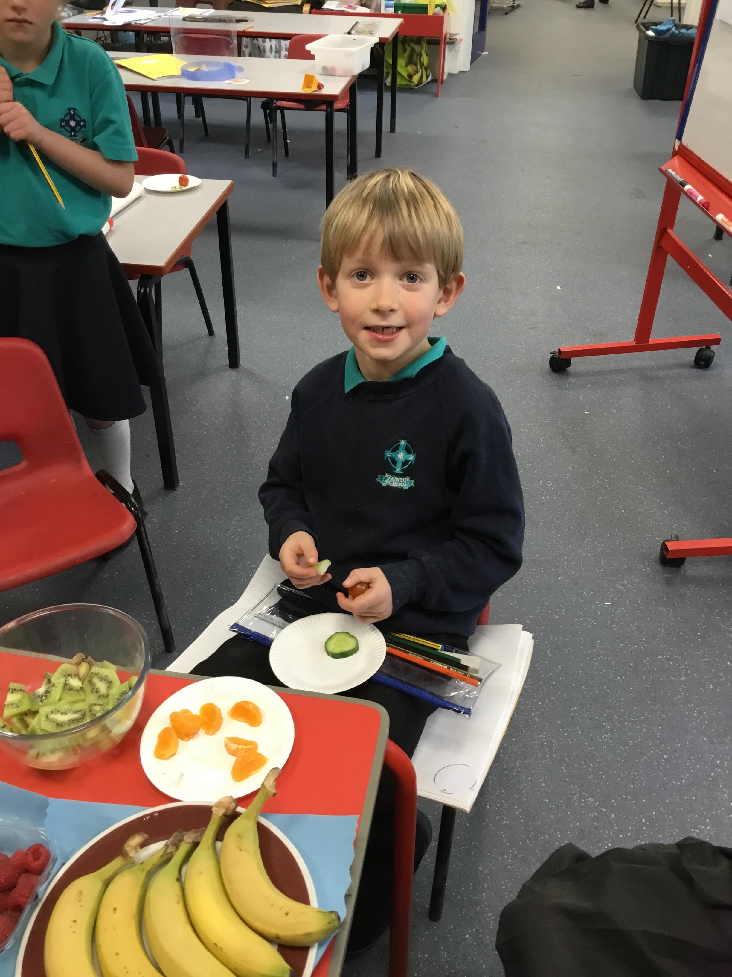 Year 1 have been focusing on their senses for our Science Week. We started our week with a senses treasure hunt and then began to learn about the human body. After spending some time looking at the body parts associated with each sense, we then looked at this question, 'Does the appearance of food affect how it tastes?'. We talked to specialists from Vista Veg and Gill from Phunky Foods to develop our knowledge about fruit and vegetables. After reading the Knobbly, Wobbly, Bobbly Celeriac and the Carrot Club stories, we then explored each of our senses by completing investigations using our sight, taste, smell and touch senses. Children described the fruit in different ways and some even tried new ones. Exploring fruit and vegetables in a variety of different ways allowed us to think carefully about our question. From our experiments we then designed our own fruit for the future. These designs were created from the results collected from our investigations during the week. We have some cool looking fruit, which would be lovely to eat!