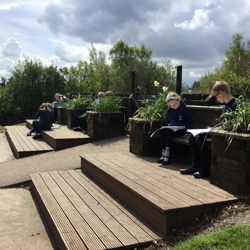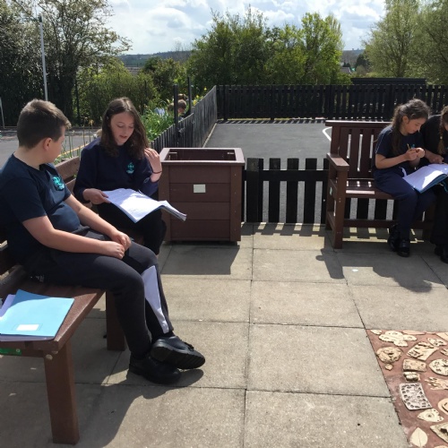 Sitting in the peaceful surroundings of the school, we read our work to our partners.